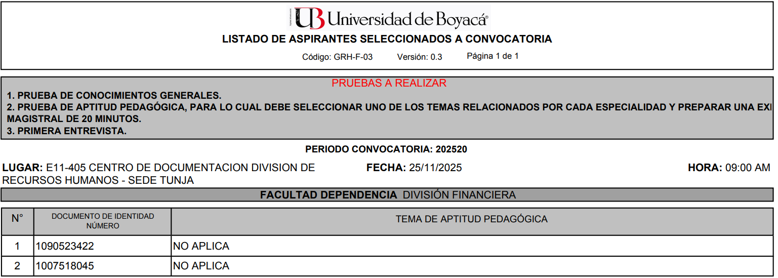 Ingreso de hojas de vida en el aplicativo de la Universidad de Boyacá debidamente soportadas: del viernes 14 de noviembre a jueves 20 de noviembre de 2025 hasta las 11:59 pm.