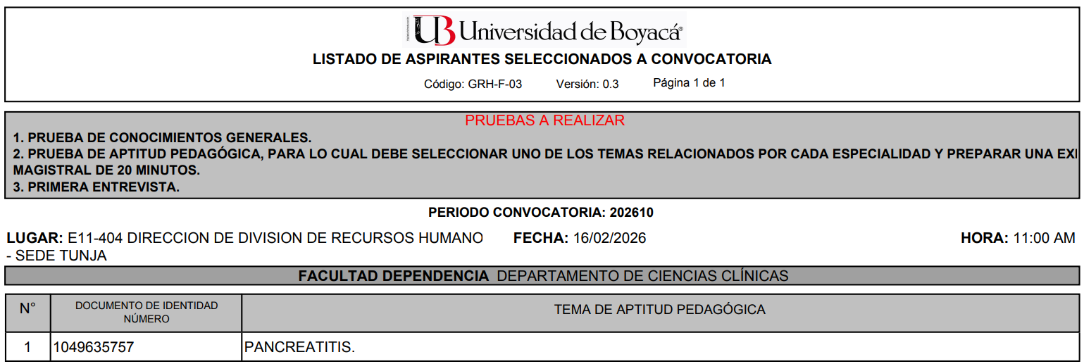 Ingreso de hojas de vida en el aplicativo de la Universidad de Boyacá debidamente soportadas: del martes 10 de febrero al miércoles 11 de febrero de 2026 hasta las 11:59 pm.