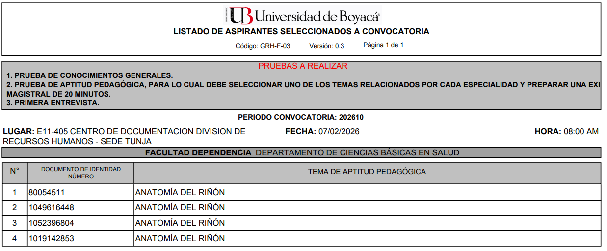 Ingreso de hojas de vida en el aplicativo de la Universidad de Boyacá debidamente soportadas: del jueves 29 de enero al miércoles 4 de febrero de 2026 hasta las 11:59 pm.