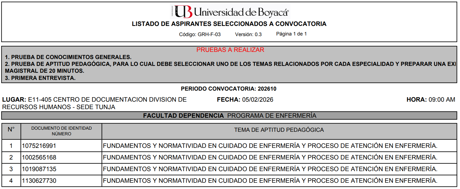 Ingreso de hojas de vida en el aplicativo de la Universidad de Boyacá debidamente soportadas: del sábado 24 de enero a domingo 1 de febrero de 2026 hasta las 11:59 pm.