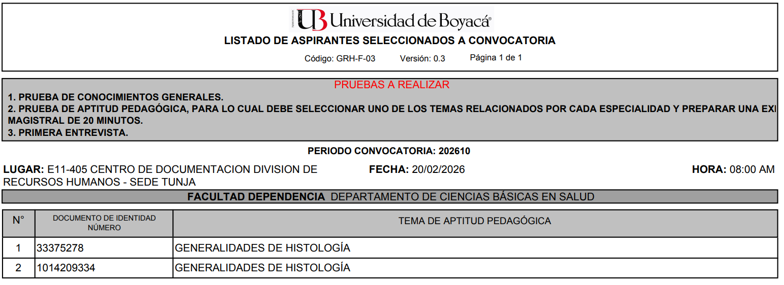 Ingreso de hojas de vida en el aplicativo de la Universidad de Boyacá debidamente soportadas: del jueves 5 de febrero al martes 17 de febrero de 2026 hasta las 6:00 pm.