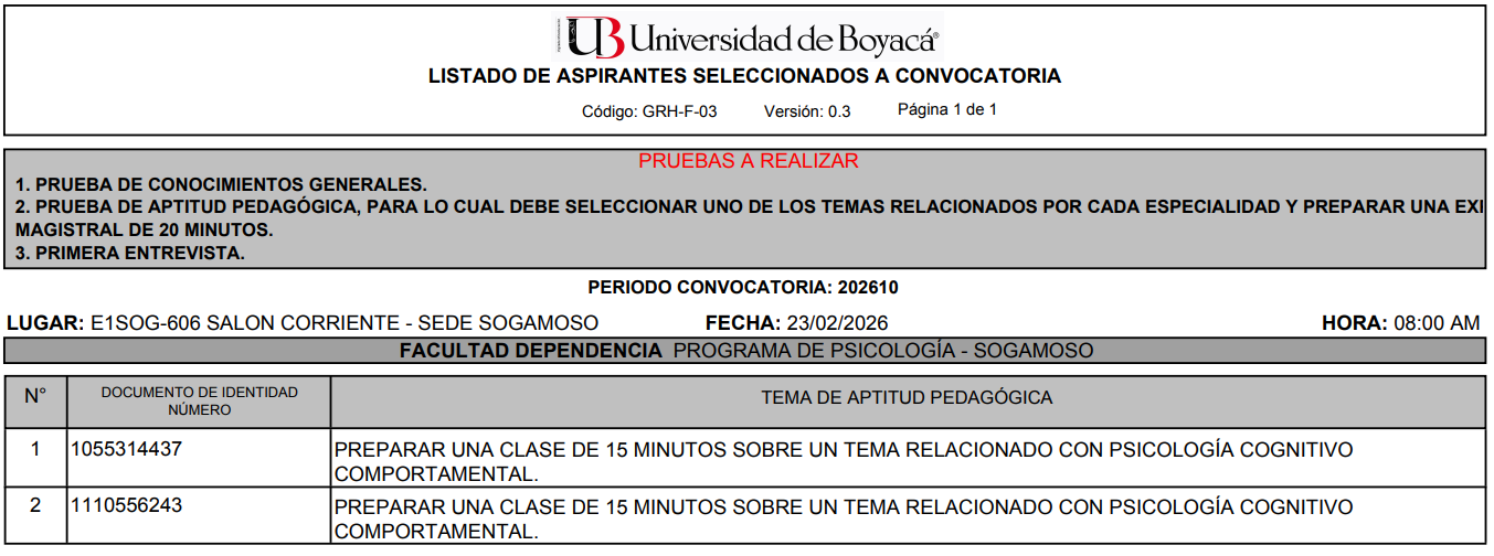 Ingreso de hojas de vida en el aplicativo de la Universidad de Boyacá debidamente soportadas: del sábado 14 de febrero a miércoles 18 de febrero de 2026 hasta las 11:59 pm.