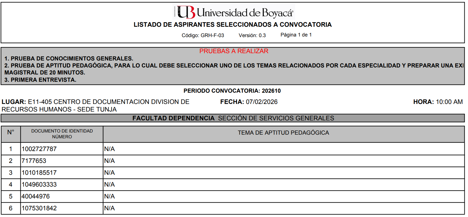 Ingreso de hojas de vida en el aplicativo de la Universidad de Boyacá debidamente soportadas: del viernes 23 de enero al miércoles 4 de febrero de 2026 hasta las 11:59 pm.