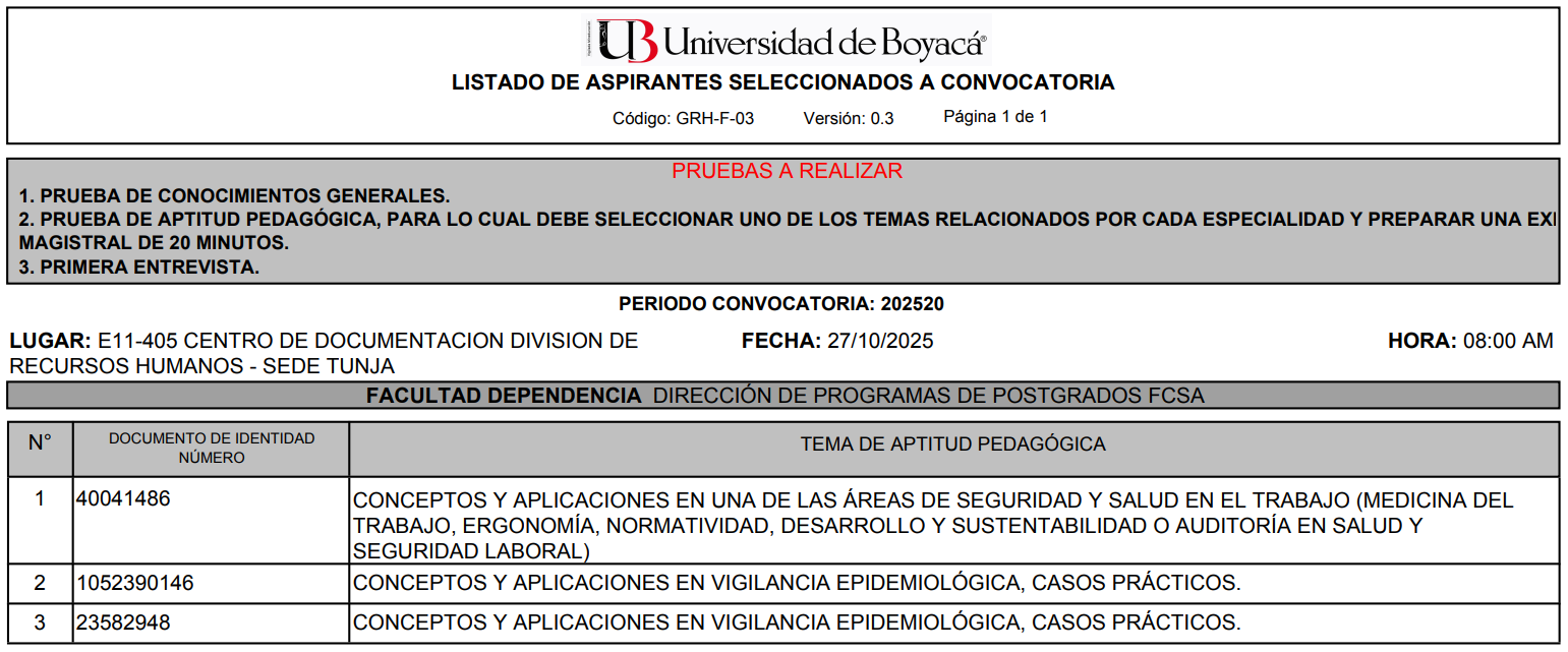 Ingreso de hojas de vida en el aplicativo de la Universidad de Boyacá debidamente soportadas: del viernes 10 de octubre a miércoles 22 de octubre de 2025 hasta las 11:59 pm.