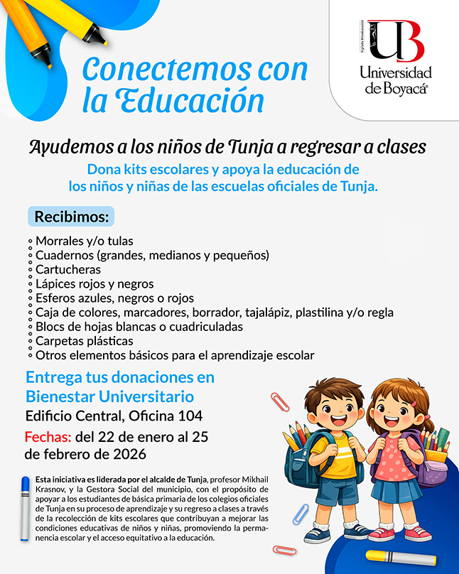 En el marco de su compromiso con la responsabilidad social, la Universidad de Boyacá invita a sus funcionarios a vincularse a la campaña solidaria “Conectemos con la educación”, liderada por la Alcaldía de Tunja, una iniciativa que busca apoyar a estudiantes de básica primaria de los colegios oficiales de la capital boyacense a través de la recolección de kits escolares (morrales, cuadernos, cartucheras, y demás elementos básicos para el estudio), a fin de fortalecer el proceso de aprendizaje y regreso a clases de miles de jóvenes. Las donaciones podrán realizarse en la oficina de Bienestar Universitario (Edificio Central, primer piso, oficina 104), del 22 de enero al 25 de febrero de 2026.
