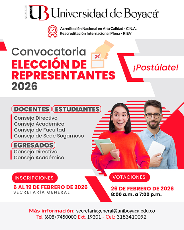 La Universidad de Boyacá invita a estudiantes, docentes y egresados a participar activamente en la Convocatoria para la Elección de Representantes 2026, un espacio fundamental para fortalecer la democracia y la participación en la vida institucional. Esta es la oportunidad de postularse y ser parte de los órganos de decisión que orientan el rumbo académico y administrativo de la universidad. Participar es aportar al crecimiento y la construcción colectiva de nuestra alma mater.